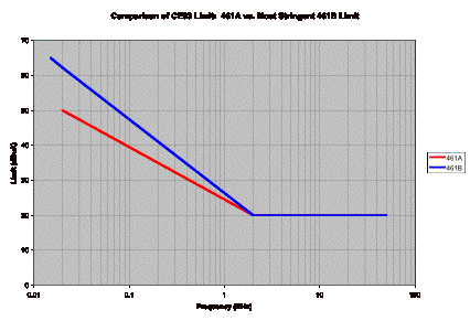 One of the most important aspects of this standard that one should be aware of is the extremely stringent limit for CE01 and CE03, conducted emissions on power leads.  The chart below compares the CE03 narrowband curve for 461A to the most stringent CE03 limit in 461B.  Although both curves specify 20 dBuA (10 uA) of current from 2-50 MHz, the A-version is more stringent at lower frequencies where low-order harmonics of switched mode power supplies (SMPSs) are likely to reside.  This would clearly impact the front-end filter design of a SMPS.